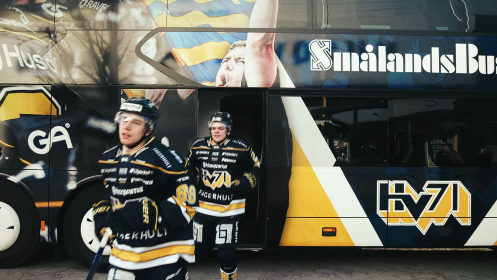 Vi är stolta över HV71s officiell spelarbuss. En dubbeldäckare med plats för 62 personer, 2+1-sittning på övervåningen och komfort som matchar laget som åker i