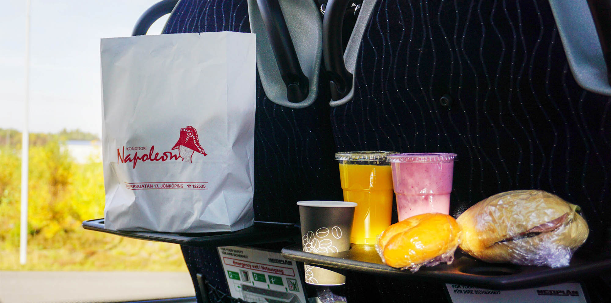 Gör bussresan extra trevlig med högkvalitativ fika från konditori Napoleon. Vi erbjuder två paket: ett klassiskt fikapaket med kaffe och bulle/fralla, eller ett större frukostpaket med fralla, bulle, juice, smoothie och kaffe. Beställ enkelt i offertformuläret.